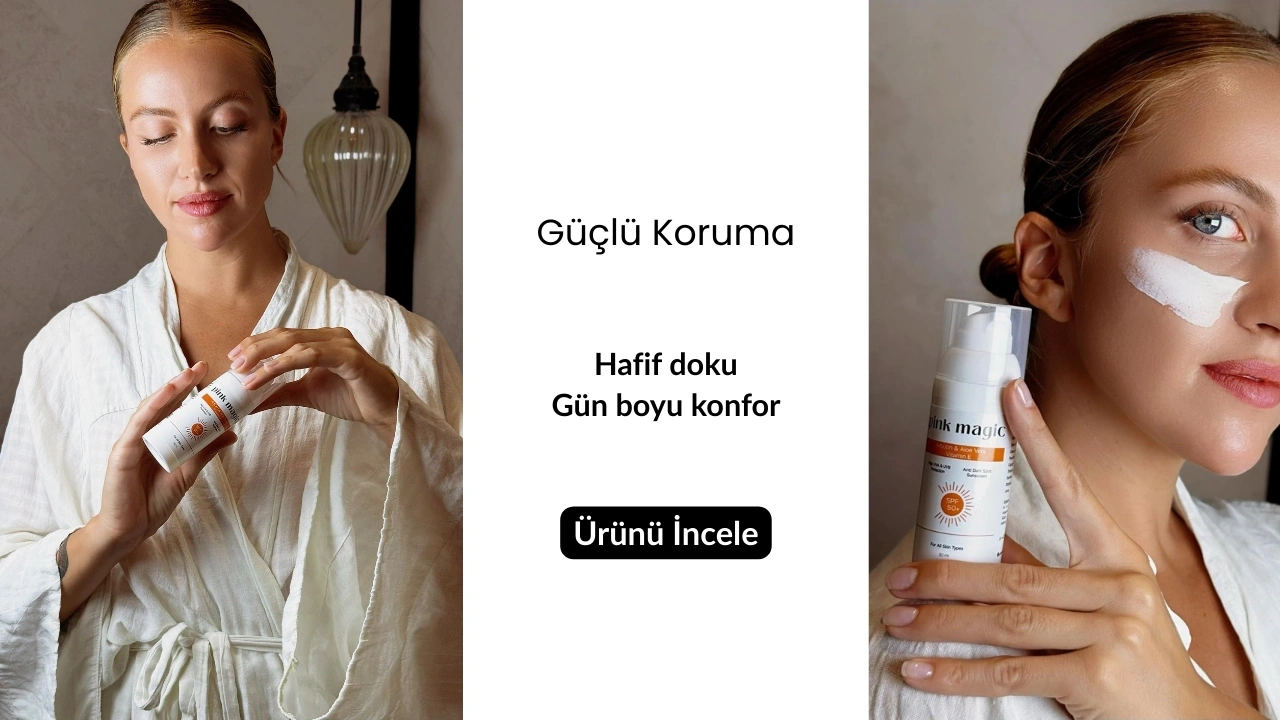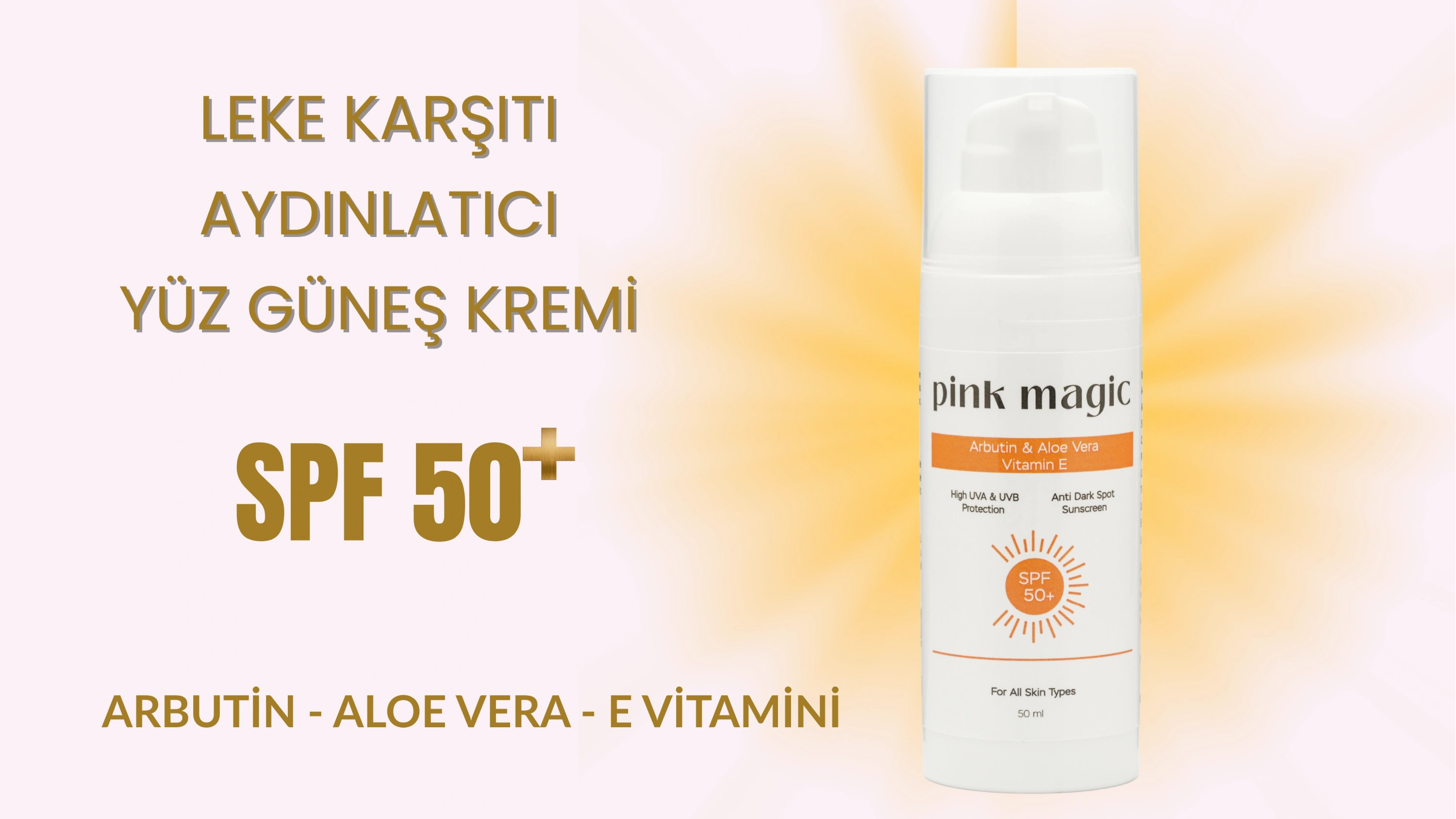Pink Magic SPF 50+ Güneş Kremi; Arbutin, Aloe Vera ve Vitamin E içeriğiyle leke karşıtı, nemlendirici ve aydınlatıcı etki sunar. Hafif dokusu sayesinde gün boyu ciltte konfor, ışıl ışıl bir görünüm sağlar.