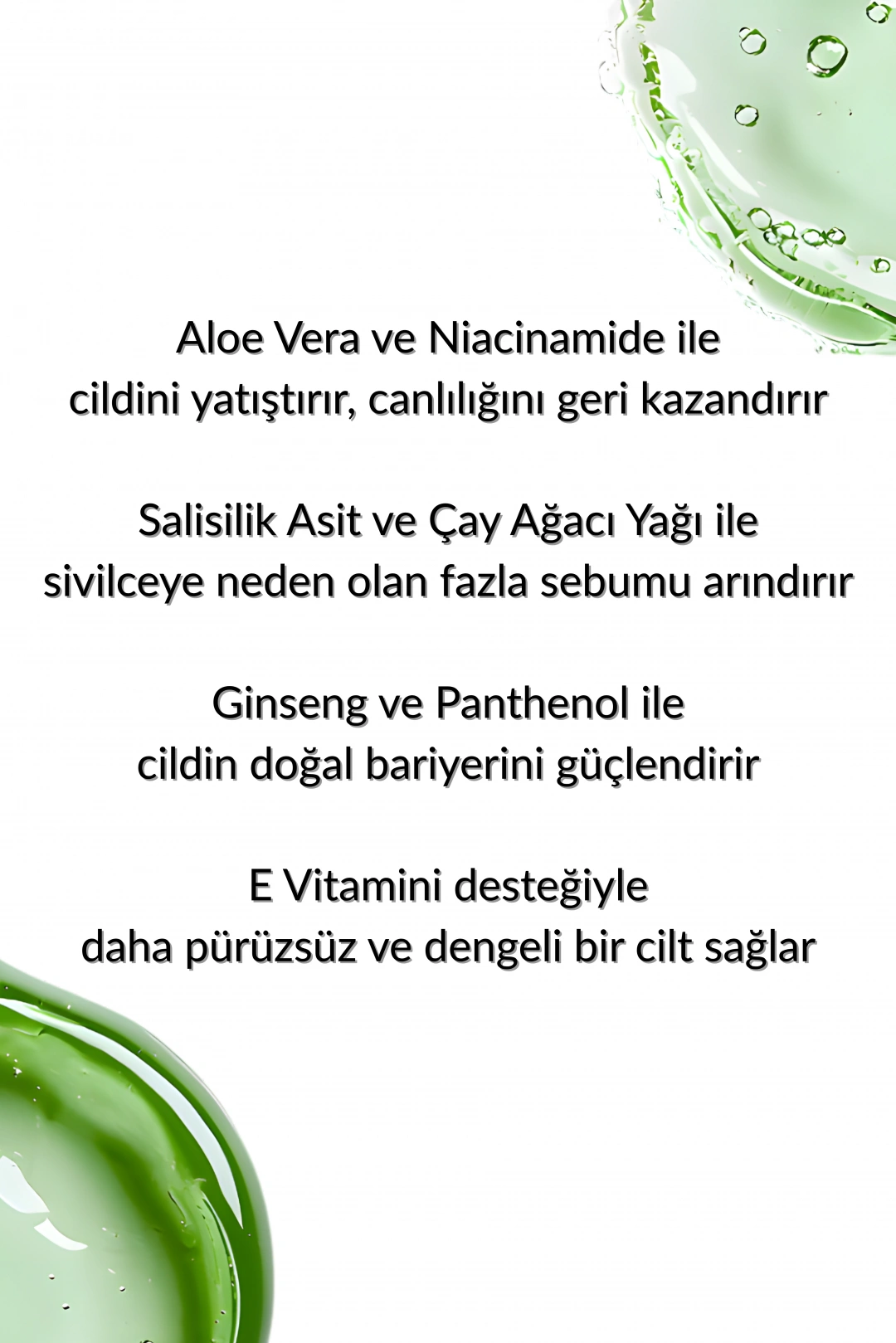 Etkin İçerikler ve Faydaları Aloe Vera: Cildi nazikçe temizler, nemlendirir ve rahatlatır. Temizlik sonrası yumuşak bir his bırakır. Niacinamide (B3 Vitamini): Cilt bariyerini güçlendirir, renk eşitsizliğini azaltır, cilde pürüzsüz bir görünüm kazandırır. Salisilik Asit: Gözeneklerin içini derinlemesine temizler, sivilce ve siyah nokta oluşumunu önlemeye yardımcı olur. Çay Ağacı Yağı: Yağ dengesini korur, cildi temiz tutar ve arındırıcı etki sağlar. Boswellia Özü: Bitkisel özleriyle cildi yatıştırmaya yardımcı olur, kızarıklık görünümünü hafifletir. Panthenol (B5 Vitamini): Cildin nem dengesini destekler, kuruluk hissini azaltır. E Vitamini: Antioksidan etkisiyle cildi dış etkenlere karşı korur, canlılık kazandırır. Gliserin: Cildi nemlendirir, temizlik sonrası yumuşaklık sağlar. Limon Asidi: Cilde taze ve aydınlık bir görünüm kazandırır.