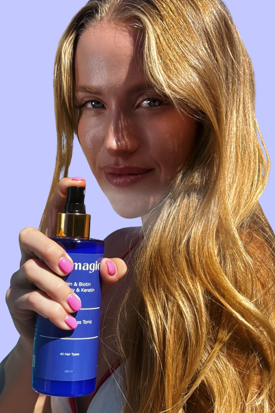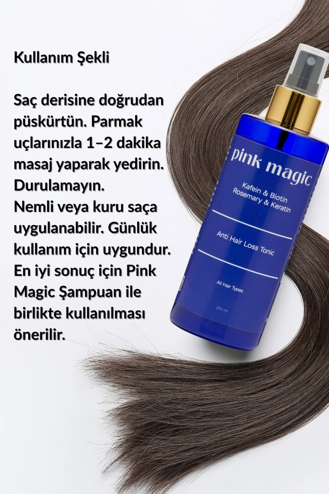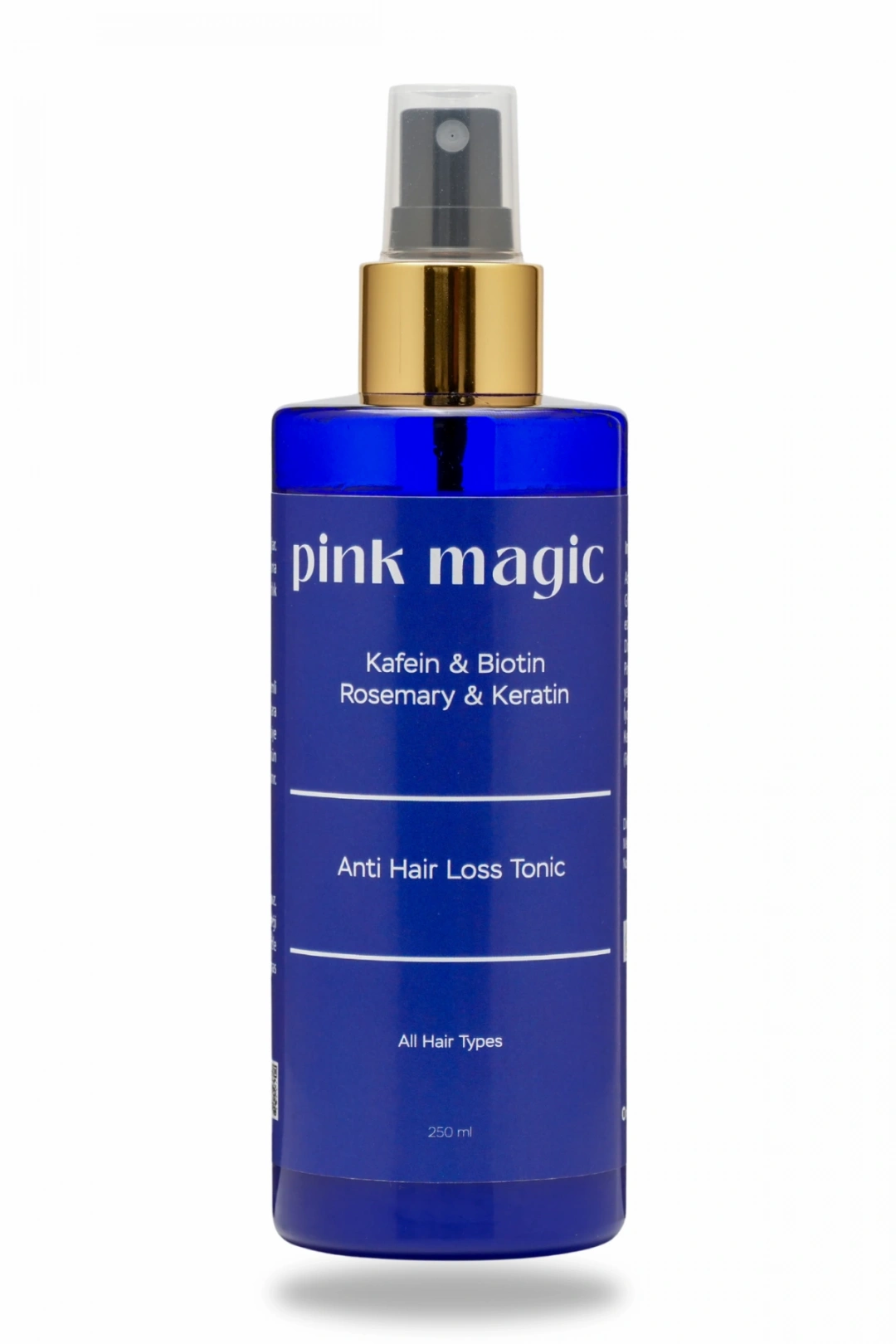 Kimler İçin Uygun? Saç dökülmesi yaşayan veya saçlarının inceldiğini fark eden kişiler Zayıf, cansız veya kırılmaya eğilimli saçlara sahip olanlar Saç derisinde kuruluk veya gerginlik hissedenler Günlük, durulanmayan pratik bakım isteyen kullanıcılar Hacim, dolgunluk ve canlılık arayan tüm saç tipleri Neden Pink Magic Saç Toniği? Kafein + Biotin + Keratin üçlüsüyle dökülmeye karşı etkili bakım sağlar. Biberiye Yağı ve Mentol saç derisini canlandırır, ferahlatır. Keratin takviyesiyle kırılmaları azaltır, saç tellerini kalınlaştırır. Hafif formülü saçta ağırlık bırakmadan kolay emilir. Nem dengesini korur, saçları gün boyu canlı ve parlak tutar.