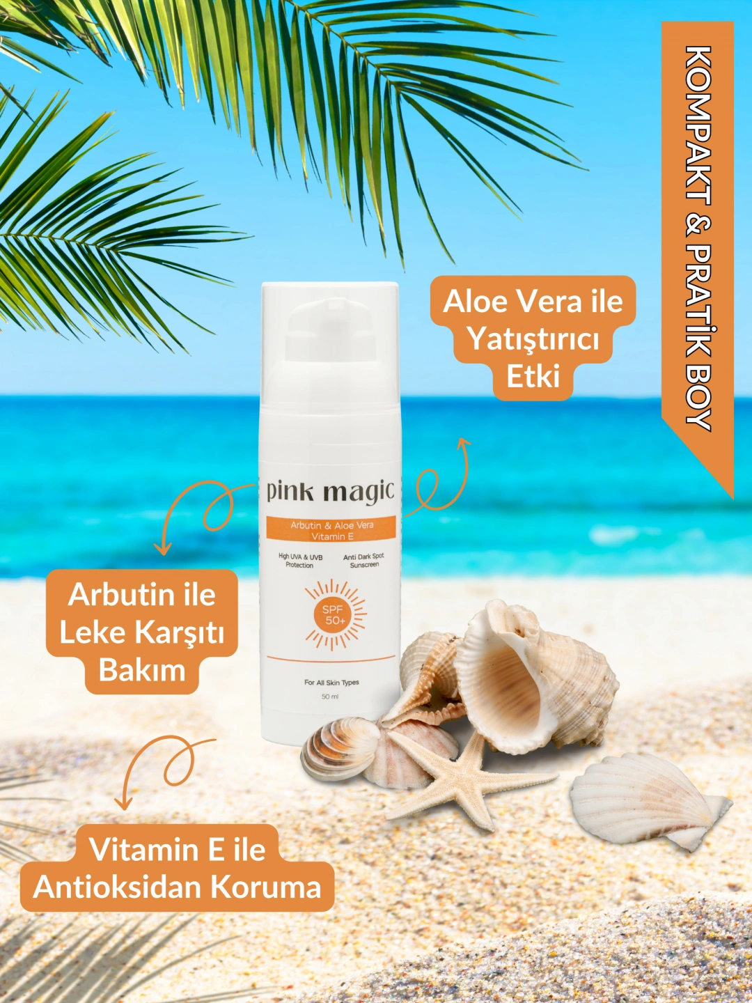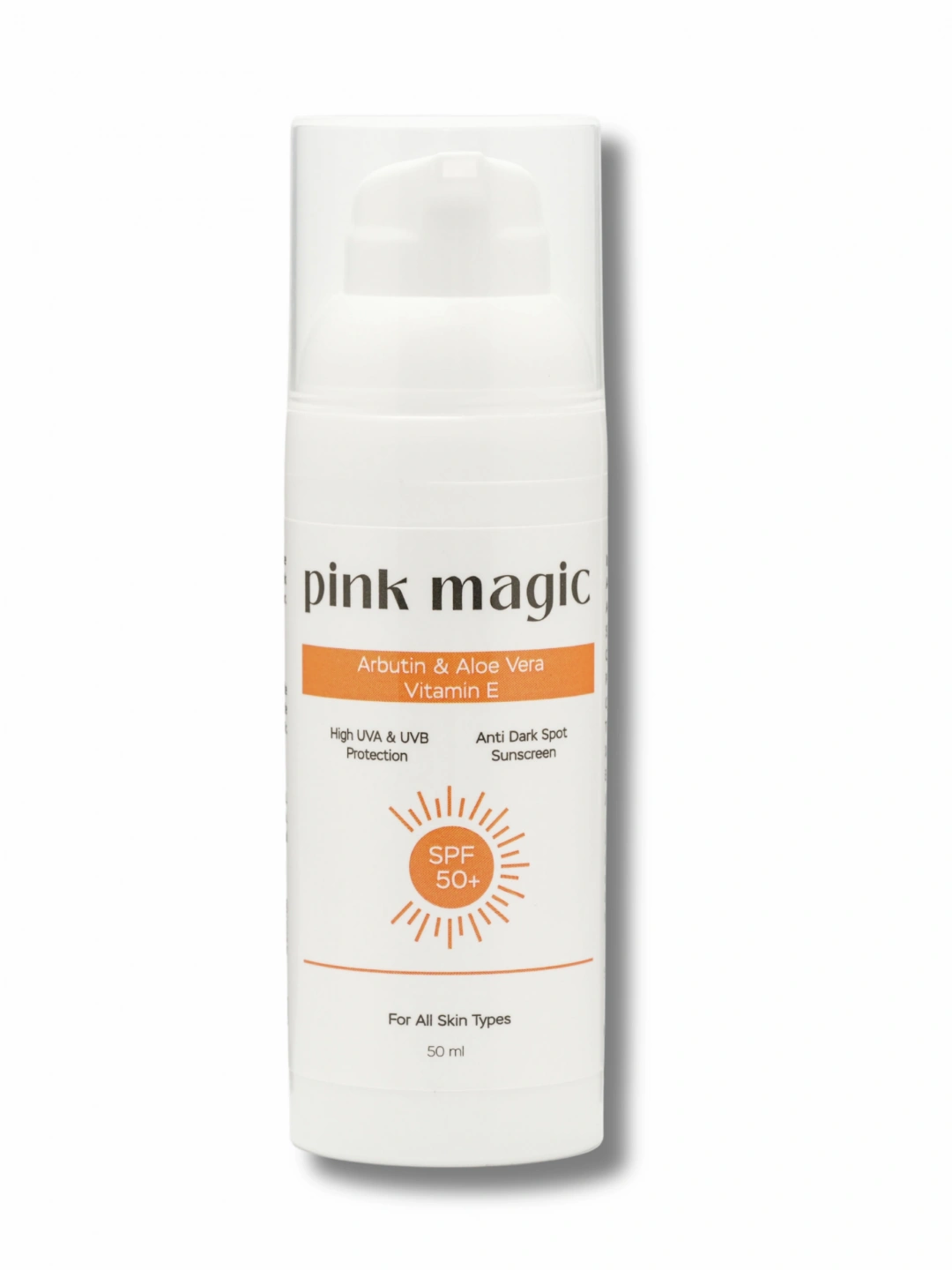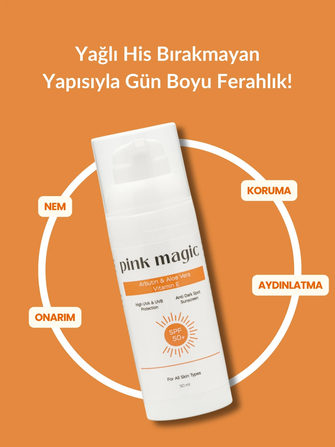 Cildinizi zararlı güneş ışınlarına karşı korurken aynı zamanda bakım yapan Pink Magic Güneş Kremi, hafif dokusu sayesinde kolayca emilir ve beyaz iz bırakmadan cilde uyum sağlar. Formülünde bulunan Arbutin ile leke oluşumunu önlemeye yardımcı olurken, E Vitamini ve Aloe Vera içeriğiyle güçlü antioksidan etki sağlar. Günlük kullanım için uygun olan bu ürün, UVA ve UVB filtreleri ile foto-yaşlanmaya karşı koruma sunar. Düzenli kullanımda cildin daha aydınlık, pürüzsüz ve sağlıklı görünmesine destek olur. Yüksek güneş koruması sağlayan formülü UVA ve UVB filtreleriyle cildinizi etkili şekilde korur. Arbutin desteği sayesinde leke karşıtı bakım yapar ve aydınlık bir görünüm kazandırır. E Vitamini ve Aloe Vera içeriğiyle antioksidan koruma sunarken aynı zamanda cildinizi nemlendirir. Hafif dokusu sayesinde kolayca emilir ve beyaz iz bırakmaz. Günlük kullanım için ideal olup yüz ve boyun bölgesinde güvenle kullanılabilir.