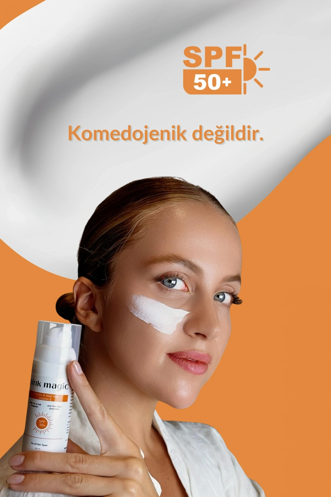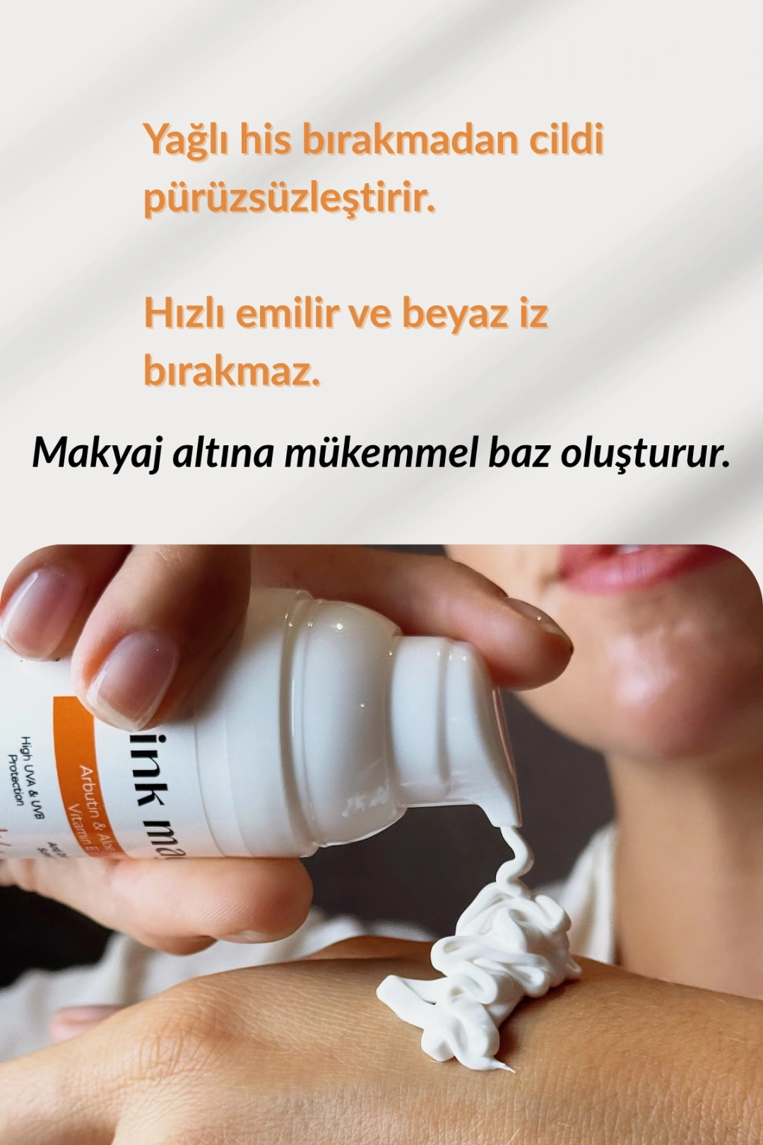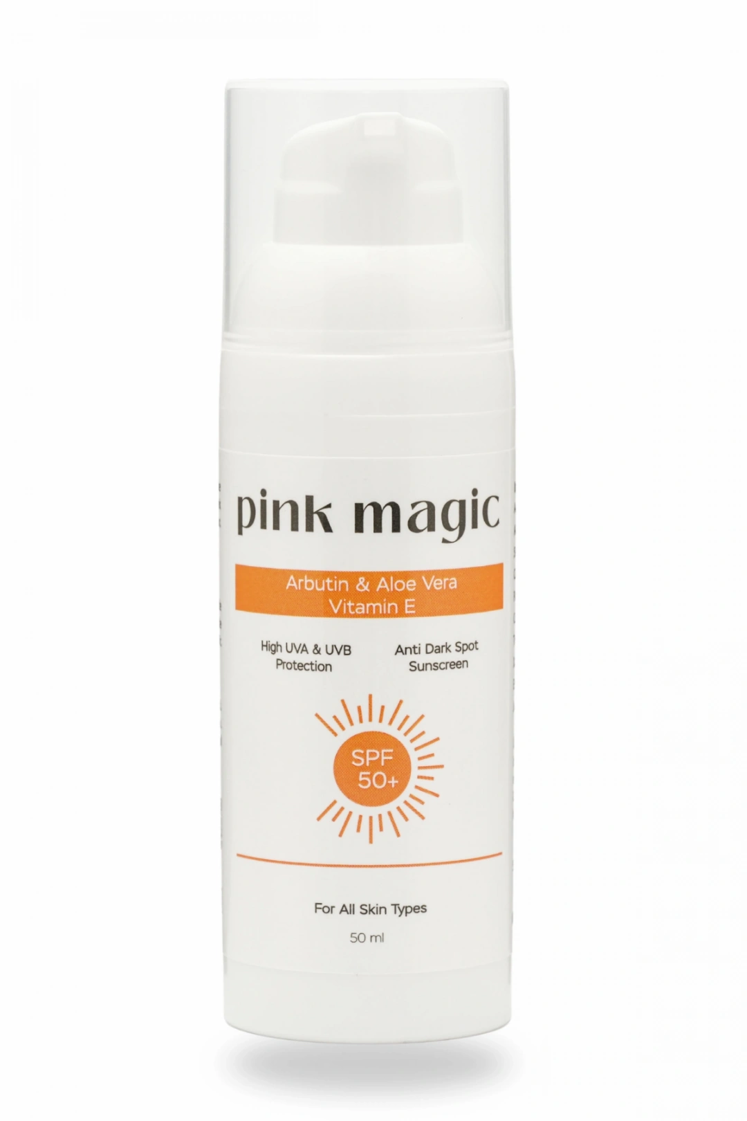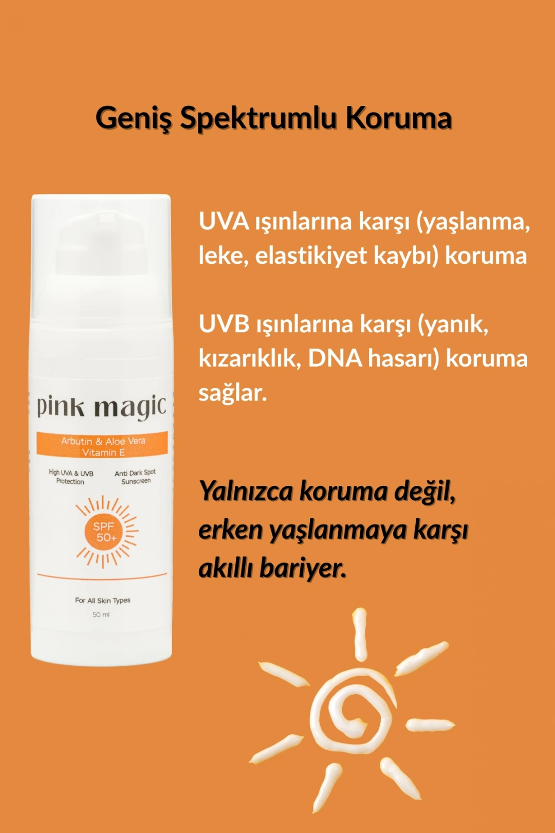 Leke Karşıtı & Nemlendirici Koruma Cildini güneşin zararlı UVA ve UVB ışınlarına karşı etkili şekilde koruyan Pink Magic Güneş Kremi, sadece koruma sağlamakla kalmaz; aynı zamanda leke oluşumunu önlemeye, nem dengesini korumaya ve cilt tonunu eşitlemeye yardımcı olur. Formülündeki Arbutin, güneş kaynaklı leke oluşumuna karşı savaşırken, E Vitamini güçlü antioksidan etkisiyle serbest radikalleri nötralize eder ve cildin erken yaşlanmasını önlemeye destek olur. Aloe Vera özü, cildi yatıştırır, nemlendirir ve ferah bir his bırakır. Hafif ve beyaz iz bırakmayan dokusu, günlük makyaj altı kullanım için idealdir. Yağlı veya kuru fark etmeksizin tüm cilt tiplerine uygun formülüyle cilde ipeksi bir pürüzsüzlük kazandırır. Öne Çıkan Etkiler