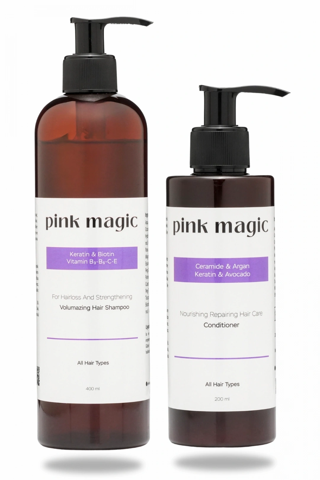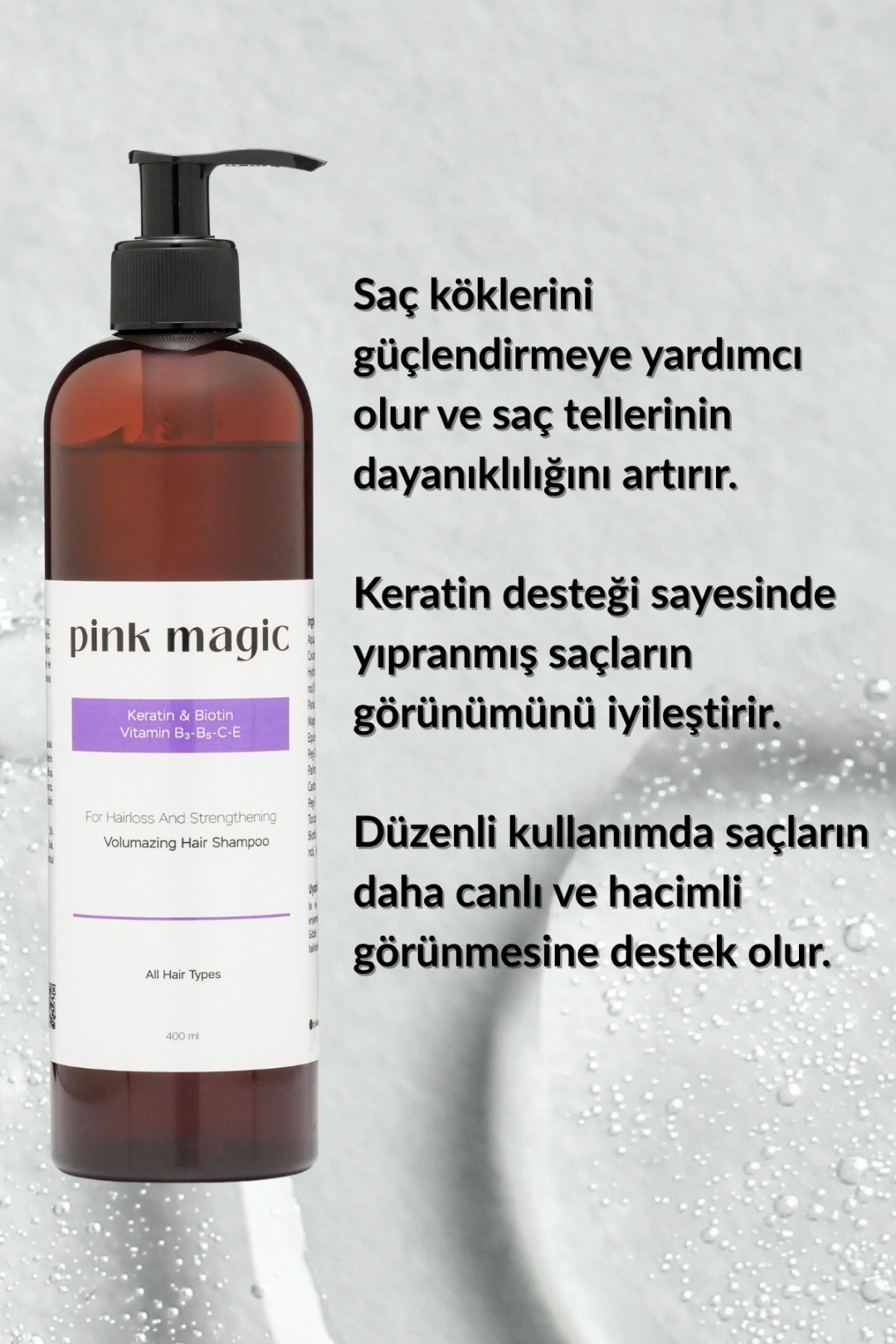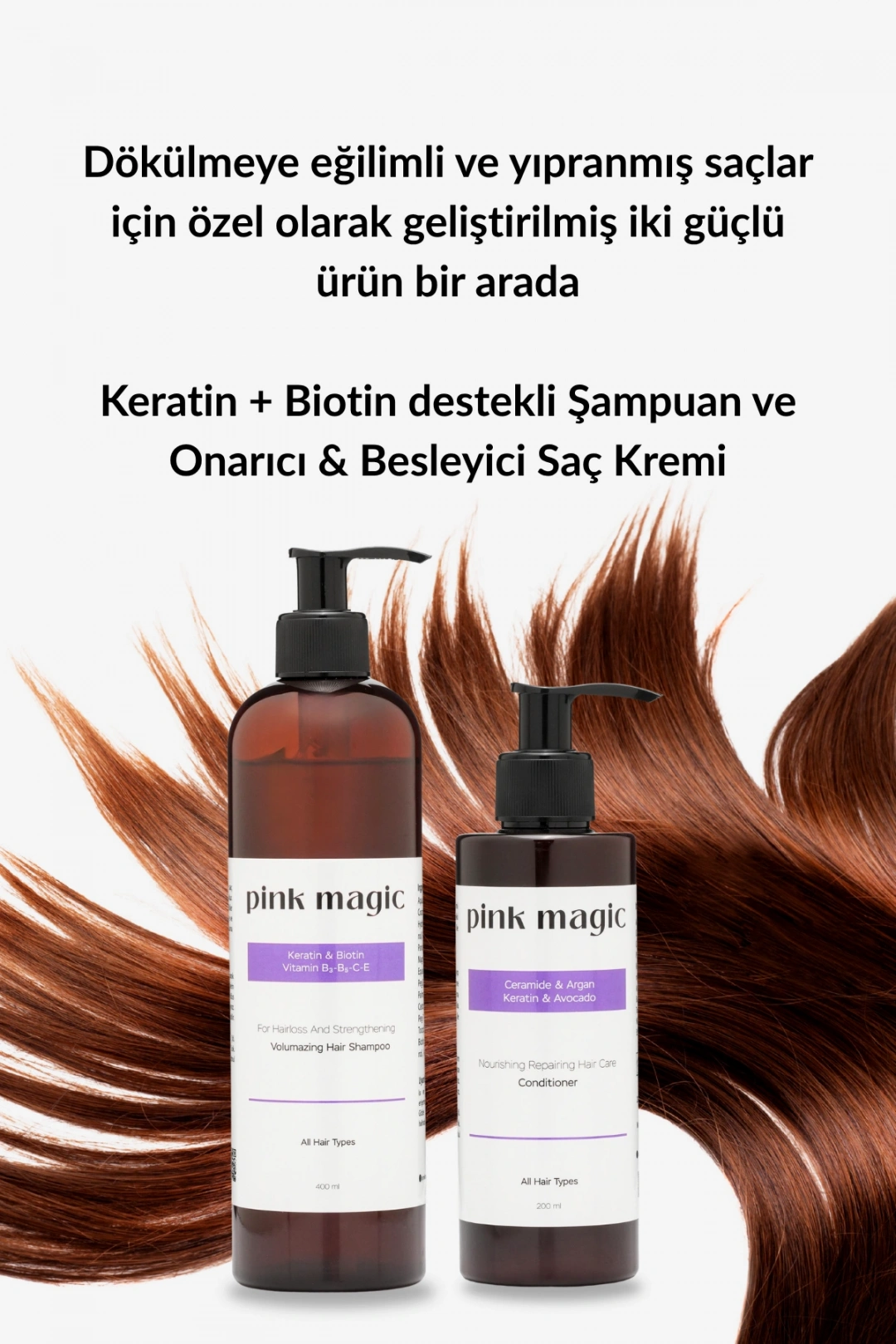 ŞAMPUAN + SAÇ KREMİ SETİ Kimler İçin Uygun? Saç dökülmesi yaşayanlar İncelmiş, güçsüz ve hacmini kaybetmiş saçlara sahip olanlar Yıpranmış, kırılan, zor taranan saç tipi olanlar Boya, ısı ve işlem nedeniyle zarar görmüş saçlar Daha dolgun, canlı ve sağlıklı görünüm isteyen herkes Günlük kullanıma uygun, hafif fakat etkili bakım arayanlar Hangi Sorunları Çözer? Saç dökülmesini azaltmaya yardımcı olur: Keratin, Biotin, Kafein ve Ginseng içeriğiyle saç köklerini güçlendirir. Zayıf ve ince telli saçları güçlendirir: Saç kalınlığını ve direncini artırır. Yıpranmış saçları onarır: Saç kremindeki Keratin, Shea Butter ve Avokado Yağı saç tellerini derinlemesine besler. Kuruluk ve matlık görünümünü giderir: Nem dengesini koruyarak daha parlak ve canlı bir görünüm sağlar. Zor taranan saçları kolaylaştırır: Anında yumuşaklık verir, elektriklenmeyi azaltır. Kırılmayı azaltır: Saç teli dayanıklılığını artırarak kopma karşıtı etki sunar. Neden Tercih Edilmeli? Pink Magic bakım seti, saç derisini arındırırken aynı zamanda saç tellerini besleyen dengeli formülüyle hem dökülme sorununa hem de yıpranmaya aynı anda çözüm sunar.