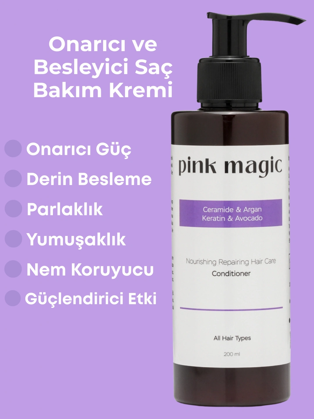 Pink Magic Keratin & Yağ Kompleksli Saç Kremi, zengin içeriğiyle özellikle kuru, işlem görmüş ve yıpranmış saçlar için özel olarak formüle edilmiştir. Keratin, saçları derinlemesine onarırken; ceramide, saç telini dış etkenlere karşı korur. Argan ve avokado yağları ise saçlara nem, parlaklık ve esneklik kazandırır. Saçlar kolay taranır, kabarmadan pürüzsüz bir görünüme kavuşur. ✔ Günlük kullanıma uygundur. ✔ Tüm saç tipleri için idealdir.