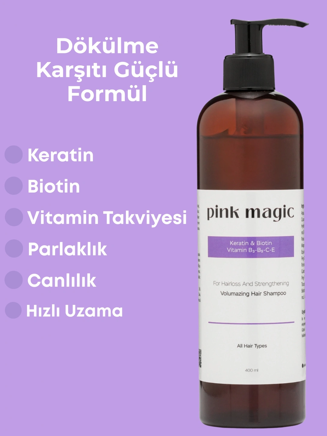 Yıpranmış ve cansız saçlara yeniden hayat verin! Pink Magic Keratin & Vitamin Kompleksli Şampuan, saç köklerinden uçlarına kadar yoğun bakım sunar. İçeriğindeki keratin saç tellerini güçlendirirken, biotin saçın daha dolgun ve sağlıklı görünmesini destekler. B5, B3, C ve E vitaminleri, saç derisini besler, saç dökülmesini azaltmaya yardımcı olur ve saçlara doğal bir parlaklık kazandırır. Düzenli kullanımda saçlarınız daha güçlü, canlı ve sağlıklı bir görünüme kavuşur.