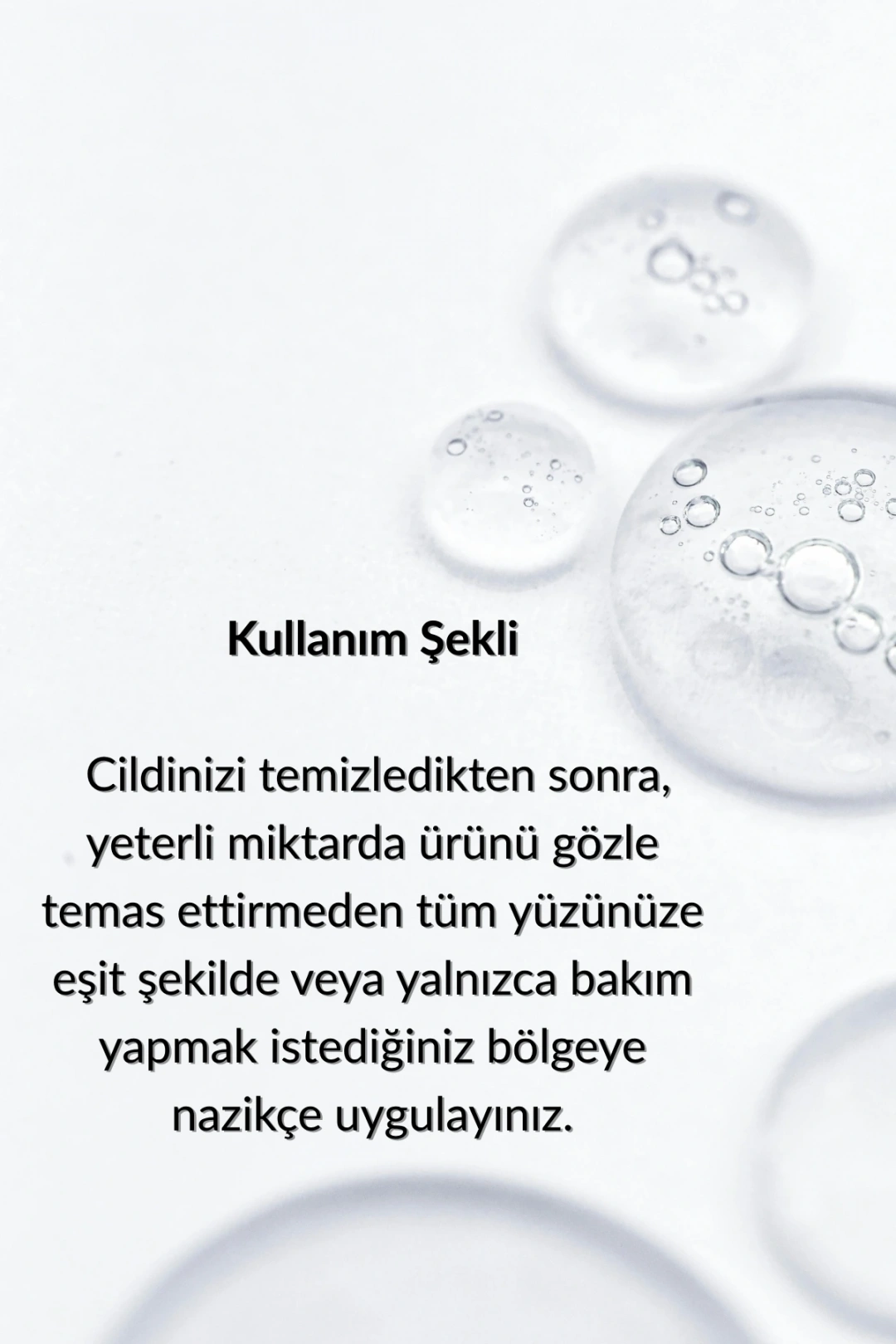 Kullanım Şekli: Cildinizi temizledikten sonra yeterli miktarda ürünü, gözle temas etmeden tüm yüzünüze eşit bir şekilde veya sadece uygulamak istediğiniz bölgeye yayarak uygulayınız.